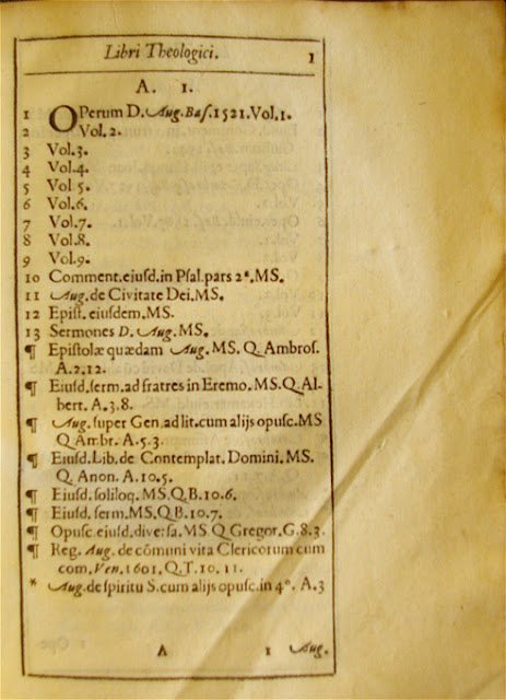 Les pages du catalogue lui-même se présentent selon un modèle constant (cliché 3): la faculté (Libri Theologici) et la pagination en titre courant, puis la lettre de série et la sous-série (A 1), suivies du détail des volumes et des textes, avec le numéro d’ordre de chacun. Nous sommes ici sur la page consacrée à saint Augustin, qui présente treize volumes, dont quatre manuscrits (n° 10 à 13). À la suite figurent les œuvres de saint Augustin reliées avec d’autres textes, et que l’on trouvera aux cotes indiquées (A 2 12, A 3 8, etc.). En bas de page, un petit opuscule in quarto ne figure par conséquent pas parmi les livres enchaînés. Le catalogue est conçu de telle manière que le chercheur travaillant sur un certain auteur trouvera rassemblés sur une même page en un même lieu les œuvres disponibles de cet auteur, mais on lui fournit aussi les indications permettant de retrouver les textes isolés inclus dans d'autres volumes. En revanche, si les notices catalographiques sont normalisées, elles restent relativement peu développées, en particulier pour les manuscrits (dont rien n'est dit de la datation, etc.).