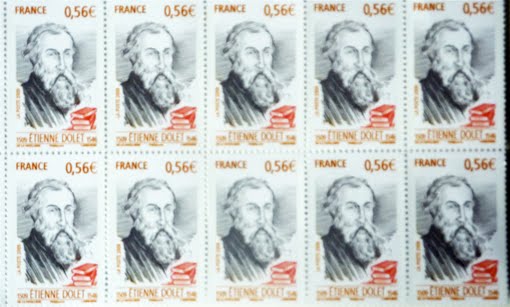 Et pour nous autres, hommes du XXIe siècle, il est tout aussi intéressant d'observer quels sont les attendus de telle ou telle commémoration. Qui, en définitive, avons-nous commémoré en éditant un timbre à l'effigie d'Étienne Dolet, imprimeur et libraire, en 2009 (voir cliché ci-dessus)? L'historien, qui est un scientifique, devra toujours rester sensible au danger d'instrumentalisation de certaines grandes figures de l'histoire: Dolet sera-t-il le chantre de la liberté de la presse (un problème qui ne se posait certes pas dans ces termes au XVIe siècle), ou celui de la Libre Pensée (un problème qui, Lucien Febvre nous l'a montré, ne se posait pas non plus dans ces termes, toujours au XVIe siècle) ? Ce qui n'enlève rien au caractère tragique de son destin, ni à la volonté qui a certainement été la sienne, de faire connaître à ses contemporains ce qu'il pensait être le bien, pour essayer de le promouvoir.