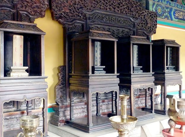 Ajoutons une dernière remarque, qui concerne certaines spécificités de l’écriture par idéogrammes. L’alphabet constitue un système de codes caractérisé par son abstraction plus poussée, alors que le lien est en principe plus immédiat, entre le dessin des idéogrammes et le signifié qu’ils représentent. Un des effets de cette opposition réside peut-être dans le statut de l’inscription, qui ne signifie pas simplement quelque chose, mais qui l’invoque et qui le fait surgir, et cela d’autant plus que l’esthétique de la calligraphie tient une place importante dans la civilisation chinoise. Au Temple du Ciel (Tiantan) comme dans d'autres sanctuaires de Pékin, on est surpris de voir, sur les sortes d’autels alignés, de simples plaquettes portant le nom de la divinité et qui sont substituées aux représentations iconographiques, sculptures, triptyques, etc., auxquels nous sommes habitués en Occident (voir cliché ci-dessous). D’une certaine manière, cette monumentalité idéographique a une fonction d’épiphanie au sens étymologique du terme (=manifestation de qq ch, action de le rendre visible).