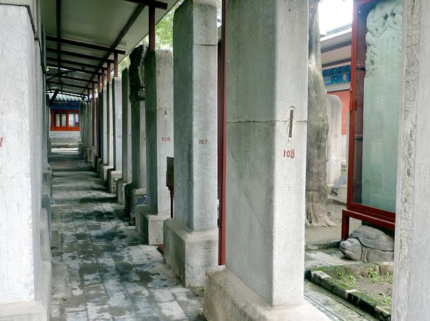 Mais, pour le visiteur non sinologue et donc nécessairement quelque peu étranger, la Chine apparaît aussi comme le pays des stèles. Le Temple de Confucius a été fondé à Pékin au tout début du XIVe siècle, et il jouxte le Collège impérial (Giozijian), où sont recrutés par concours, puis formés les hauts fonctionnaires (mandarins) de l’Empire. Les stèles gravées (voir cliché ci-dessous) sont d’abord destinées à la commémoration des hauts faits de l’Empereur, et à la biographie des candidats reçus. D’autre part, le Temple possédait à l’origine 189 stèles portant le texte des treize classiques confucéens. Outre la fonction première des stèles, on peut aussi penser qu’elles rendent de réaliser, par simple frottis, une reproduction à usage privé du texte qu’elles proposent.