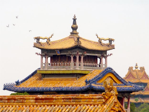 Clichés: 1) Toitures de la Bibliothèque, Cité interdite; 2) Une forêt de stèles; 3) Tête d'une tortue portant une stèle; 4) Exemple d'autels portant des tablettes votives.
