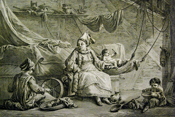 Ill.: le comte de Choiseul-Gouffier est bien entendu d'abord un "antiquaire", mais qui se découvre ethnologue lorsqu'il nous donne l'image la plus précise de la vie quotidienne des habitants des pays qu'il traverse. Ainsi d'un intérieur grec dans une île de l'Égée (2), ou de la cour du caravansérail sur une route d'Asie mineure (3). (Clichés F. Barbier).