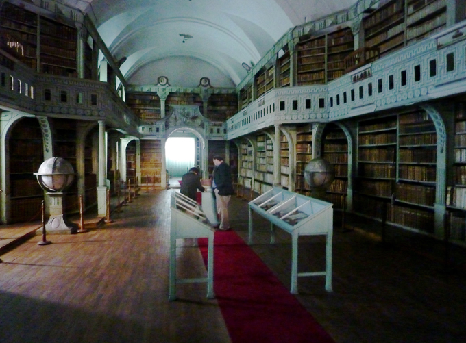 Une fois passé Brad, nous entrons franchement dans le paysage montagneux de la Transylvanie au sens historique et géographique du terme, par la route 74, qui monte jusqu’à Abrud, avant de redescendre vers Alba Julia (Gyulafehérvár / Weißenburg), notre destination finale: nous y sommes à 13 heures, donc après quelque 7 heures de route. Même si le paysage forestier est superbe (cliché 1) et même si les routes ne sont pas mauvaises, elles ne sont pas non plus toujours bonnes, tant s’en faut, et on ne circule pas si facilement en Transylvanie…Alba Julia se situe sur la grande rivière du Mureș / Maros, affluente de la Tisza. C’est une ville très importante aujourd’hui, et nous venons y visiter la bibliothèque du Batthyaneum (cliché 2). Le nom est dérivé de celui de la famille hongroise des Batthyány, elle-même divisée en trois branches, les princes, les comtes et les barons Batthyány. Boldizsár Batthyány (1537-1590), converti au protestantisme, possédait dans sa résidence de Güssing (Németújvár) une bibliothèque dont l’essentiel a été acheté à Francfort.