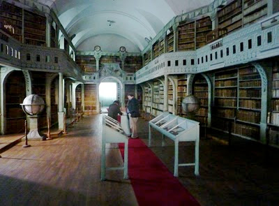L’ensemble du complexe du Batthyaneum est entièrement abrité dans une église désaffectée, et dont la nef a été subdivisée en différents niveaux, la bibliothèque occupant le dernier de ceux-ci. L’aménagement intérieur, parfaitement conservé, date de la fin du XVIII siècle, et la décoration picturale est très remarquable, avec des figures allégoriques diverses (Minerve, etc.) et une suite de petites peintures sur le thème de la bibliothèque (cliché 3). Les collections peuvent atteindre quelque 50000 livres anciens, dont un riche fonds de manuscrits et plus de 500 incunables. La pièce la plus remarquable est le Codex aureus du IXe siècle.