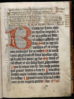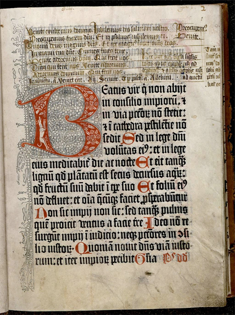 L'incipit traditionnel- lement rubriqué (autrement dit copié en rouge par le rubricateur) est ici imprimé en rouge, ce qui complique et renchérit le travail d'impression. Mais la superbe lettre filligranée et peinte est  réalisée après coup à la main, très certainement par des spécialistes présents dans l'atelier même de l'imprimeur.