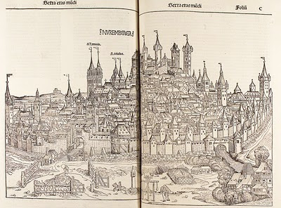 En effet, le choix est, d'abord, celui d'un ouvrage exceptionnel, qui impressionne par son format (in folio) et plus encore par sa magnifique illustration xylographiée  (on sait que le jeune Albrecht Dürer y a collaboré). La double page donnant la vue de Nuremberg à la fin du XVe siècle est bien sûr la plus spectaculaire, d'autant qu'il s'agit d'une représentation réaliste (les artistes étaient sur place et connaissaient la ville), et non pas, comme pour certaines autres villes, d'une sorte de juxtaposition de ce que nous pourrions presque appeler des "clichés" (cf. la vue de Lyon, celle de Constantinople, etc.).