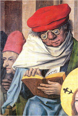 La diffusion de l’objet est sensible à travers sa présence plus fréquente dans des scènes de la vie quotidienne. Van Eyck peint à Bruges en 1436 la magnifique Vierge et le chanoine Joris van der Paele: on apprécie la figure très personnalisée du chanoine, myope, et qui tient ses lorgnons à la main (cliché 2). Le manuscrit, probablement un bréviaire de petit format, porte une reliure à recouvrement qui permet de le garder à l'abri avec soi tout au long de la journée. L’attention donnée par l’artiste à la perspective fait que la figure du donateur est à la même échelle que celle de la Vierge.