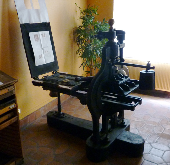 (Cliché: une presse métallique à balancier, Musée del'imprimerie, Lyon).