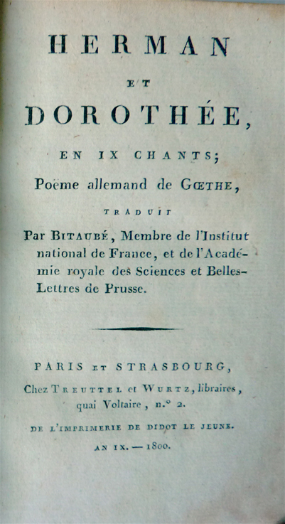 La seconde traduction française d’un texte de Goethe n’est donnée que plusieurs dizaines d’années plus tard, puisqu’il s’agit de Herman et Dorothée en IX chants, que publie Treuttel et Würtz à Strasbourg et à Paris en l’an IX (1800): un petit volume très soigné, présentant successivement l’avant-titre, le frontispice, le titre, puis la «Préface du traducteur» et enfin le texte en prose. Le volume est élégamment imprimé par Didot le jeune.