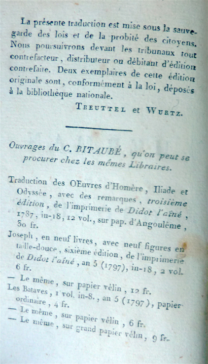 Hermann et Dorothée paraît en original en 1797, de sorte que la traduction française n’enregistre qu’un décalage de trois ans par rapport à cette date. Le rôle du traducteur, qui semble probablement à l’initiative de la publication, est souligné par la mise en livre: le verso de l’avant-titre indique les titres des ouvrages de Bitaubé sortis des presses de Didot et disponibles chez Treuttel et Würtz (la troisième édition d’Homère (1787), Joseph et Les Bataves, tous deux de 1797). Puis la page de titre mentionne le nom de Goethe et implicitement la langue du texte original («poëme allemand»), mais elle précise surtout l’identité du traducteur et ses titres.