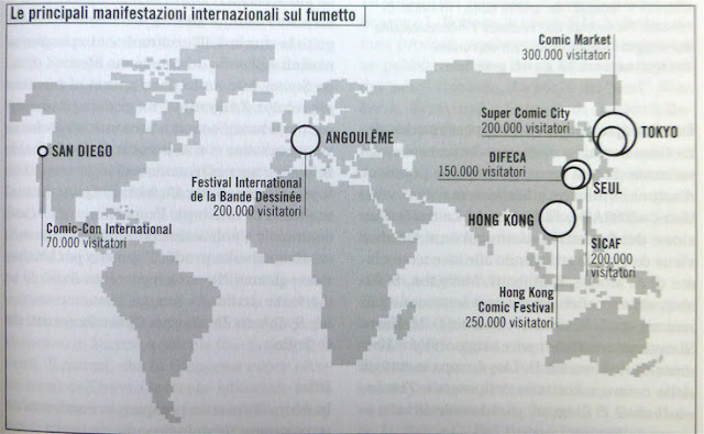 Quant à notre troisième exemple, ce sera une carte, qui met en évidence l’existence d’infosphères dans lesquelles la spécialisation donne parfois à telle ou telle ville un statut hors de proportion avec son poids réel. C’est ce phénomène qui permet par exemple à Angoulême, de s’imposer aujourd’hui dans le domaine des salons relatifs à la bande dessinée, et dans le domaine plus général de l’économie de celle-ci. Le statut de l'infosphère dans l'histoire d'Angoulême est peut-être plus particulièrement favorable, il n'en reste pas moins que c'est un choix politique récent qui explique que cette ville moyenne de la province française voisine avec des métropoles mondiales comme Tokyo ou Séoul et Hong Kong, voire San Diego (en Californie).