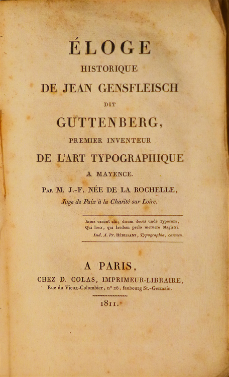Éloge historique de Jean Gensfleisch dit Guttenberg, premier inventeur de l’art typographique à Mayence. Par M. J.-F. Née de la Rochelle, juge de paix à La Charité sur Loire, A Paris, chez D. Colas, imprimeur-libraire, rue du Vieux-Colombier, n° 21, faubourg St.-Germain, 1811, 8°, [4-]VI-158 p., ill.