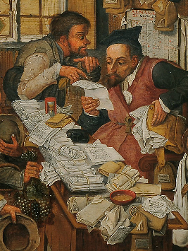 Mais le contrôle exercé par la ville, grâce aux pratiques de l’écrit, sur le son plat-pays, n’est pas un phénomène d’aujourd’hui –nous évoquions à ce propos l’exemple du Dénombrement de Bethléem. Une autre toile d’un autre Breughel reprend le thème, de manière quelque peu satyrique: il s’agit de l’Avocat des paysans, peint par Pieter Breughel à Anvers dans les premières décennies du XVIIe siècle (1620). L’avocat (mais il s’agit peut-être du notaire?) est un technicien de l’écrit, et sa maîtrise lui permet de dominer les arcanes d’une administration judiciaire dont les paysans ont trop souvent besoin. Il s’est arrêté au bourg, où il a peut-être un bureau temporaire (à moins qu’il ne reste quelques jours à l’auberge?), et c’est là qu’il reçoit les plaignants. Plus richement habillé, il est enfoui sous des masses de paperasses et de procédures: son statut social et ses revenus viennent de ce qu’il connaît les techniques de l’écrit et du droit.Un jeune clerc tient le secrétariat près de la porte. Les détails sont savoureux (la physionomie des personnages!), dans cette scène presque balzacienne. Les paysans se présentent respectueusement, le couvre-chef à la main, et certains apportent des volailles, des fruits, ou encore un panier d’œufs, à titre de paiement. Un jeune homme de bonne condition est debout près de l’avocat: un autre clerc? Nous penserions plutôt à quelque fils de bonne famille venu quémander l’ouverture d’un crédit. La maîtrise de l’écriture crée, au sens propre, de la richesse et du pouvoir: elle assure notamment la maîtrise de circuits financiers fondés sur le «papiers», alias des valeurs (lettres de change, billets à ordre) qui sont les premiers instruments du crédit.