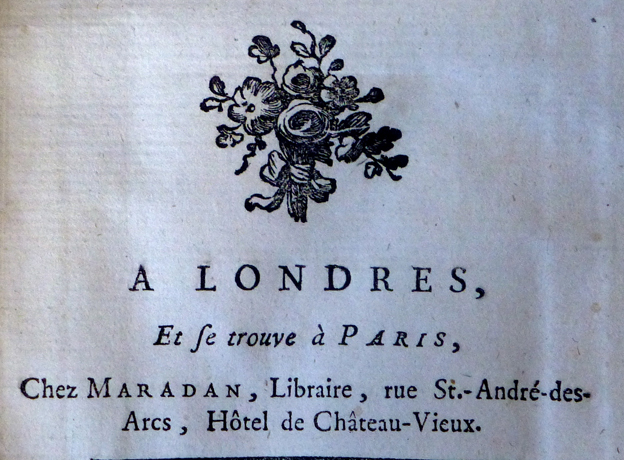 Mitchell souligne aussi que le nombre de ces adresses double en 1788 et 1789 par rapport à 1787, pour retomber ensuite presque complètement: «En étudiant les rubriques « Londres », nous étudions encore un autre des usages de l’Ancien Régime qui fut balayé par la Révolution» (p. 161). Enfin, il indique que Maradan figure précisément parmi les professionnels ayant le plus utilisé cette rubrique (à six reprises en quelques années, cf p. 163). Cette problématique de l'adresse comme élément de la publicité (au sens moderne du terme) a été reprise par Jean-Dominique Mellot dans un article de la Revue française d’histoire du livre daté de 1998 (t. II, p. 33-68).