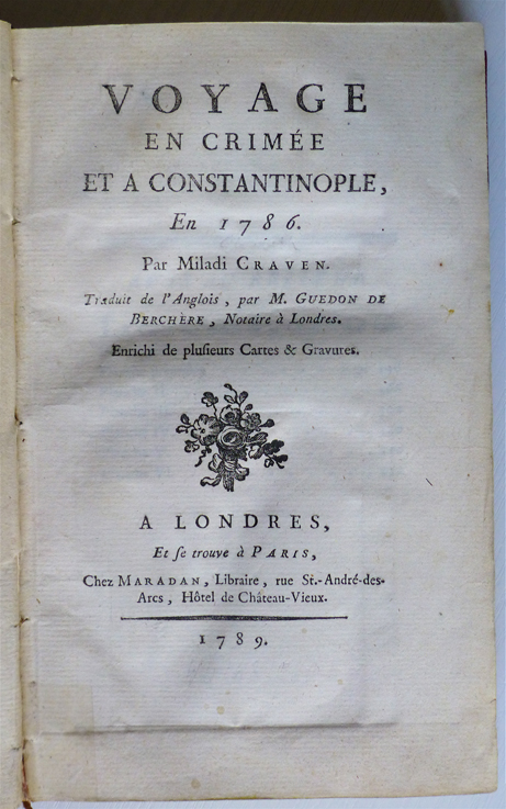 Craven, Lady Elisabeth Berkeley, margravine d’Ansbach-Bayreuth, Voyage en Crimée et à Constantinople, en 1786, par Miladi Craven. Traduit de l’anglais par M. Guédon de Berchère, notaire à Londres. Enrichi de plusieurs cartes et gravures, À Londres, et se trouve à Paris, chez Maradan, Libraire, rue Saint-André-des-Arcs, Hôtel de Château-Vieux, 1789, [6-]443-[5]p., 1 carte et 6 pl. dépl., 8°(les 5 pages non chiffrées in fine proposent un extrait du catalogue du libraire).