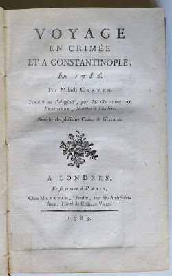 Or, l’ouvrage présente plusieurs particularités remarquables du point de vue de l’histoire du livre. Rappelons, d’abord, que notre noble anglaise, née Berkeley en 1750, épouse Lord Craven en 1767, mais qu’elle s’en séparera une quinzaine d’années plus tard, pour entreprendre en 1786 un remarquable périple à travers l’Europe de son temps. Partie de Londres, la voici à Paris et à Tours, d'où elle gagne successivement Lyon, Marseille, Gênes et Florence, puis Venise, Vienne, Varsovie et Saint-Pétersbourg. Lady Craven descend alors vers le sud, pour gagner la Crimée via Moscou. Puis c'est la Mer Noire, et l'arrivée à Constantinople, où elle est reçue par le comte de Choiseul et d’où elle visite l’«Archipel» et Athènes. Elle rentrera en «Europe» par la Bulgarie, la Valachie («Buccorest»), la Transylvanie (Hermannstadt/ Sibiu) et à nouveau Vienne.