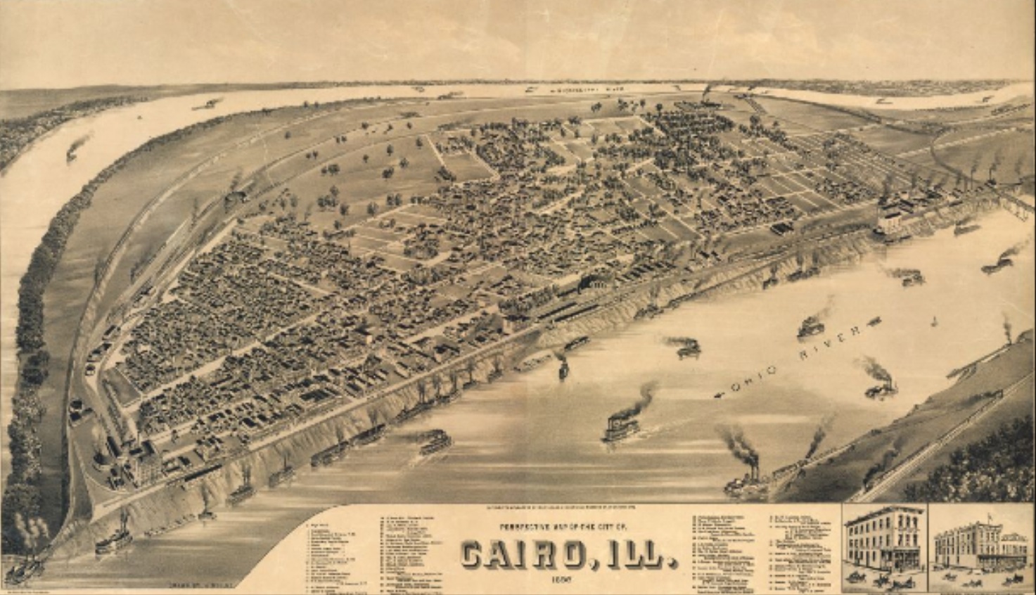 Cairo est fondée en 1837, à un emplacement réellement stratégique, à savoir le confluent de l’Ohio (à droite sur le cliché), descendant de la région des lacs Érié et Ontario, et du Mississipi (à gauche), dont la source est à la hauteur du Lac Supérieur. La ville devient rapidement l’entrepôt des grandes plaines, son activité pour le passage des fleuves est ininterrompue, et l’arrivé du chemin de fer elle-même la sert pendant un temps: c’est en effet à Cairo que les lignes parties de Chicago s’arrêtent, et que se fait le transbordement sur les célèbres vapeurs du Mississipi, vers la Nouvelle-Orléans.