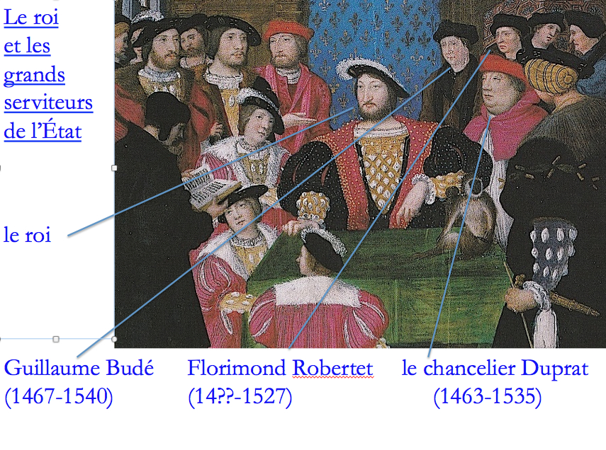Nous passerons plus rapidement sur les personnages figurant sur la droite du tableau, et qui représentent la génération précédente. Deux d’entre eux peuvent à bon droit être considérés comme les figures inamovibles placées à la tête des affaires, à savoir le trésorier de France Florimond Robertet (?), et le chancelier, le cardinal Duprat, lequel meurt d'ailleurs l’année suivante (1535). Quant à Guillaume Budé, soixante-sept ans, il n’est devenu un proche du roi qu’à partir de 1520, mais s’est dès lors imposé comme la figure principale de l’humanisme «à la française». Rappelons qu’il est depuis 1522 le «garde de la librairie» de Fontainebleau, tandis que Mellin de Saint-Gelais sera, de son côté, nommé «garde de la librairie» de Blois après la mort du dauphin.