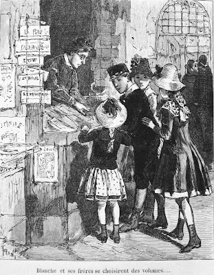 Mais les séminaires et autres colloques se raréfient pendant les mois d'été, laissant d'autant plus de temps pour la lecture et pour l'écriture. La librairie de gare (cf ci-dessous) illustre l'un des volumes de la célèbre "Bibliothèque des chemins de fer", Les Vacances à Trouville de Louise Chéron de la Bruyère (éd. 1888): les enfants, au moment de partir pour la mer, choisissent leurs lectures de voyage, et on s'amusera de voir Hachette faire plus ou moins discrètement, par le texte et par l'image, la promotion de sa propre maison et de ses propres titres. La scène se déroule certainement Gare Saint-Lazare, et l'habillement de nos jeunes voyageurs témoigne de l'aisance de la clientèle du nouveau quartier de l'Europe, et de l'ouest parisien en général, depuis le dernier tiers du XIXe siècle. Dans l'imagerie de la Librairie Hachette, la bibliothèque de gare est d'une certaine manière un lieu "distingué" au sens bourdieusien du terme.